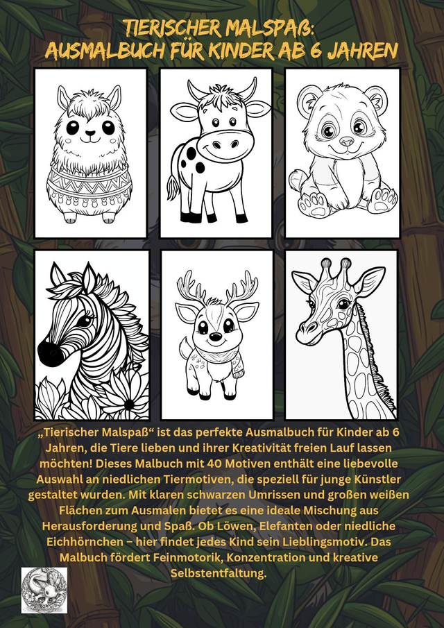 „Tierischer Malspaß“ ist das perfekte Ausmalbuch für Kinder ab 6 Jahren, die Tiere lieben und ihrer Kreativität freien Lauf lassen möchten! Dieses Malbuch mit 40 Motiven enthält eine liebevolle Auswahl an niedlichen Tiermotiven, die speziell für junge Künstler gestaltet wurden. Mit klaren schwarzen Umrissen und großen weißen Flächen zum Ausmalen bietet es eine ideale Mischung aus Herausforderung und Spaß. Ob Löwen, Elefanten oder niedliche Eichhörnchen – hier findet jedes Kind sein Lieblingsmotiv. Das Malbuch fördert Feinmotorik, Konzentration und kreative Selbstentfaltung.